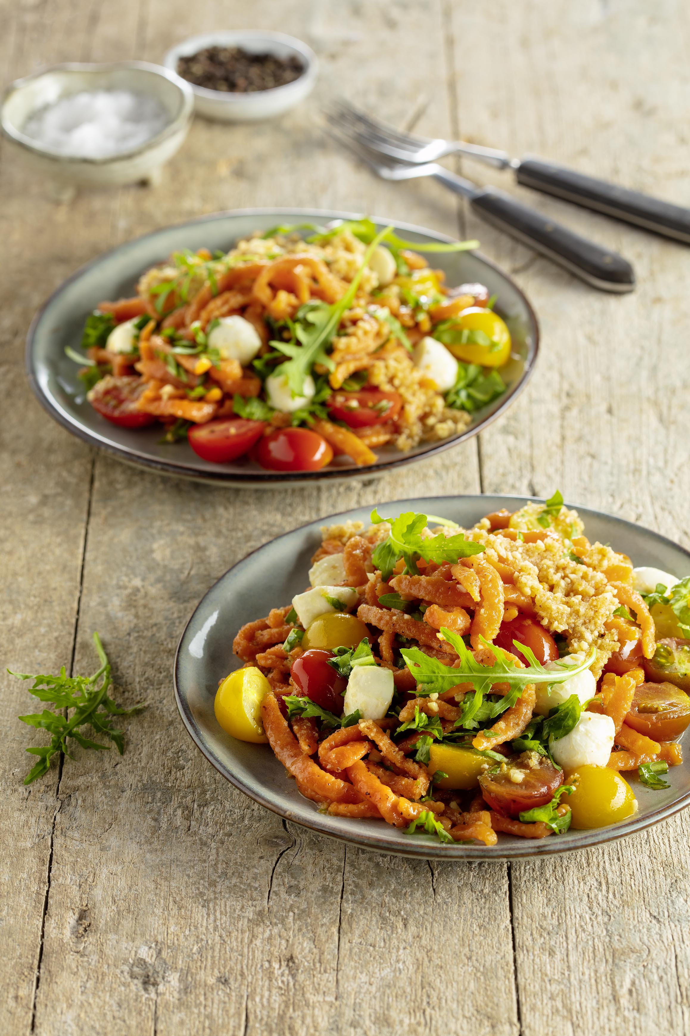 Vegetarisches Gericht mit Tomatenspätzle, Mozzarella, Rucola und Mandeln